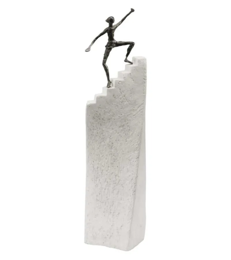 Smuk bronzefigur på hvid sten med titlen “Trin til Succes”. En positiv og livsbekræftende holdning hjælper let og næsten legende til at klare trinene til succes. Bronzefiguren er af den velrenommerede kunstner Luise Kött-Gärtner.
