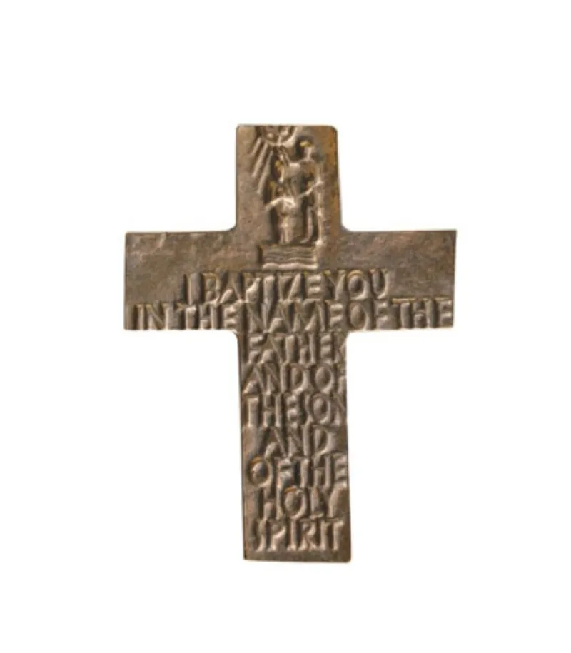 Smuk bronzekors som kan gives i gave til en person, der skal døbes eller er blevet døbt.