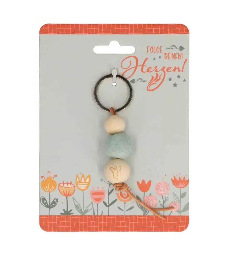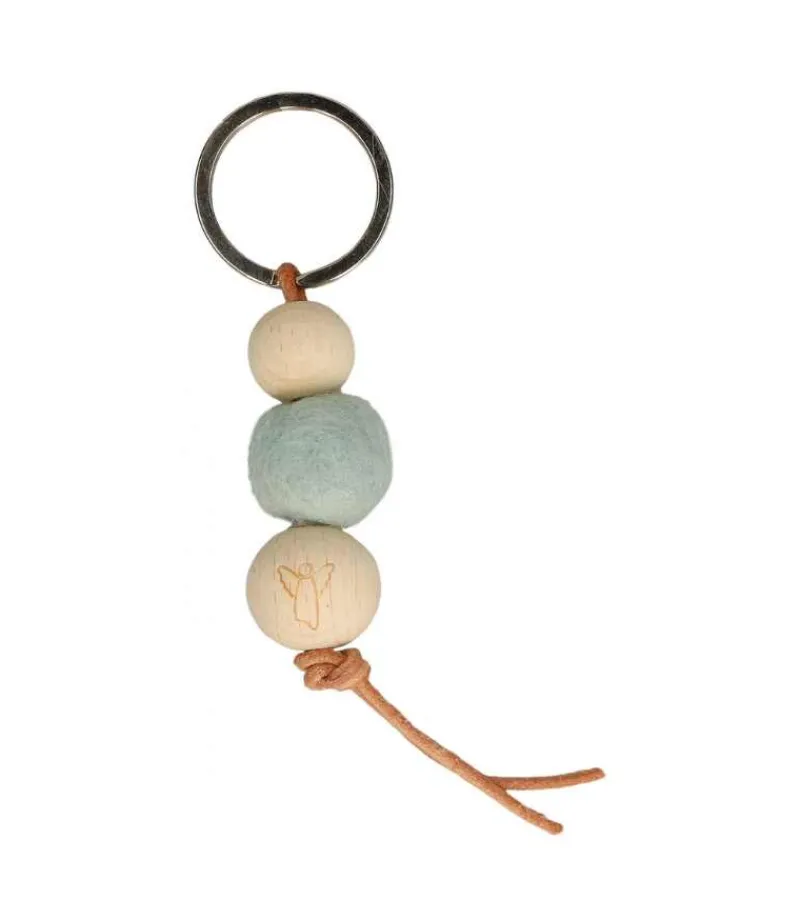 Nøglering med limegrøn filtkugle og to trækugler, med englesymbol som lasergravering på den store trækugle, med moderne læder snor.