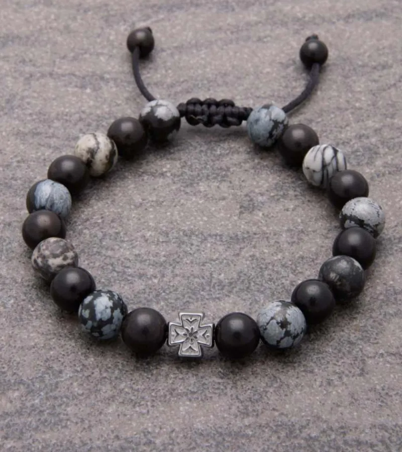Håndlavet herrearmbånd (Kan også bruges til kvinder) med sorte 8 mm perler i halvædelstenene Snowflake Obsidian og Black silk stone og med et lille kors i midten af rustfrit stål.