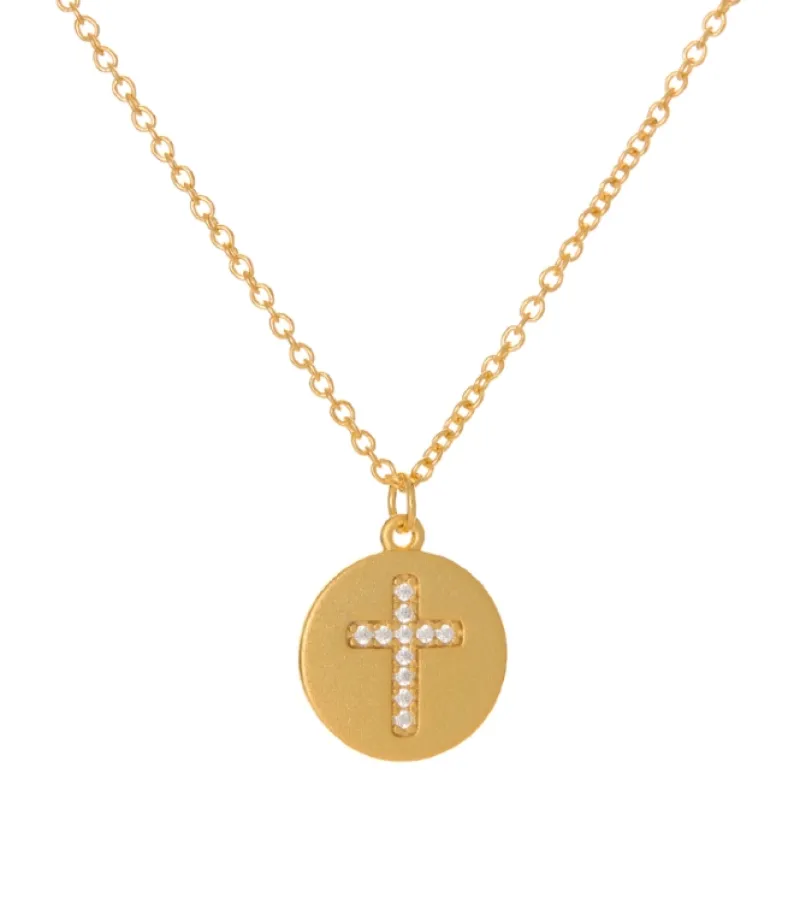 Lille smuk rund medaljon, med et indfattet kors i klare facetslebne zirkoner. Medaljon har en fin satin overflade, der giver et eksklusivt look. Kæden har en 5 cm lang extension kæde, så du kan justere længden som du ønsker den.