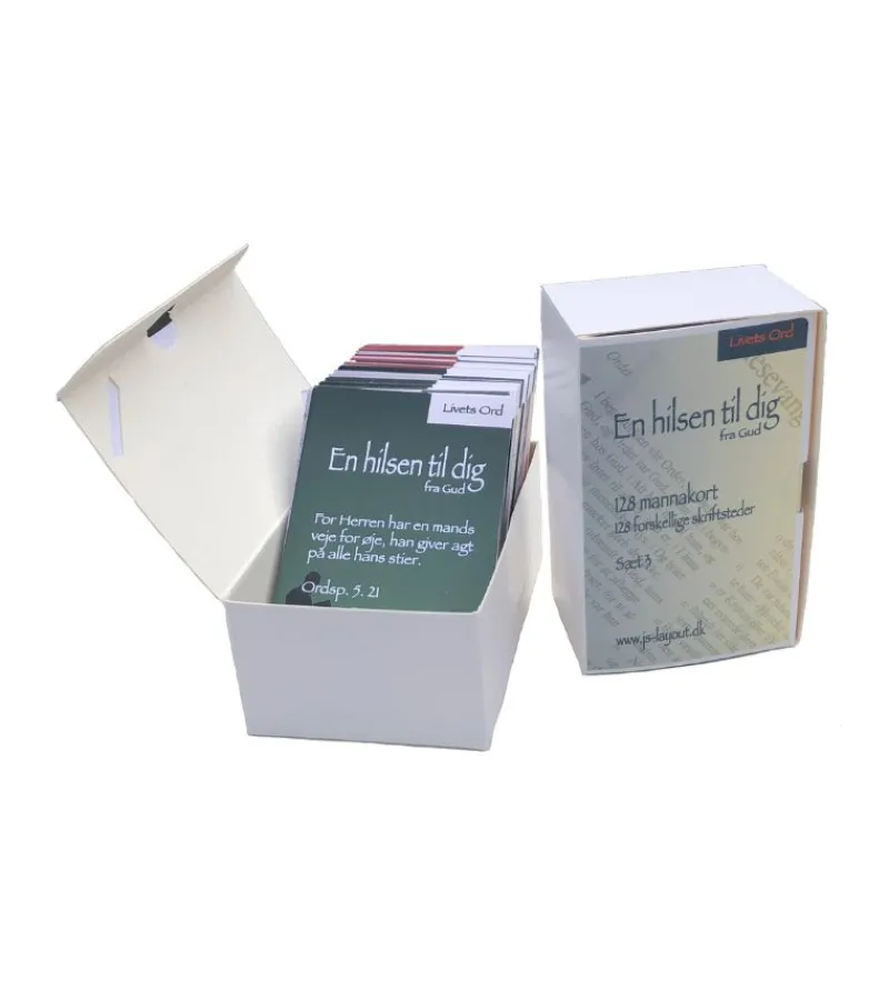 Mannakort med titlen “en hilsen til dig fra Gud”. 128 kort med forskellige skriftsteder fra Biblen.