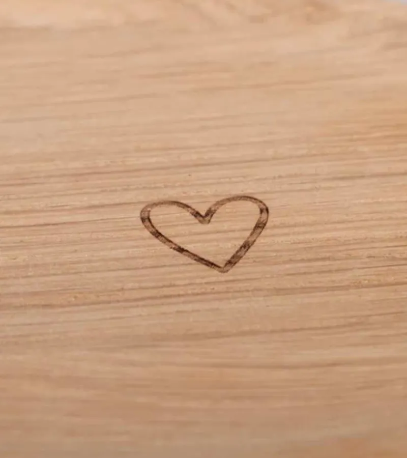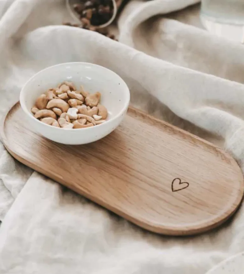 Super flot oval-formet bakke i egetræ, indgraveret med et lille hjerte.
