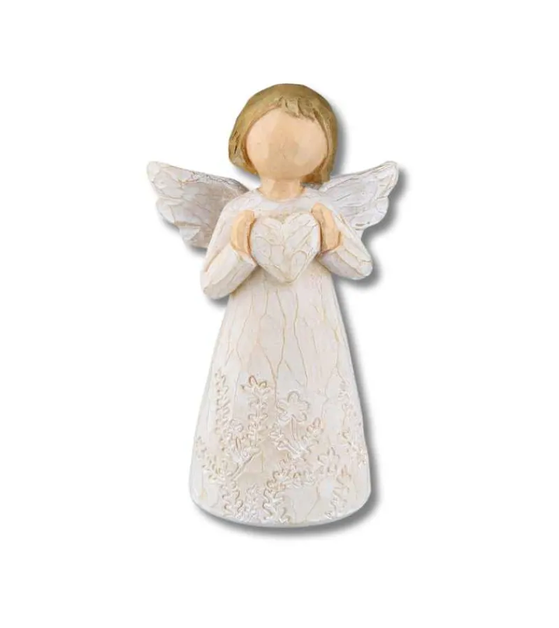 Lille smuk figur af en engel med et hjerte i sine hænder, med motiv af blomster på sin kjole.
