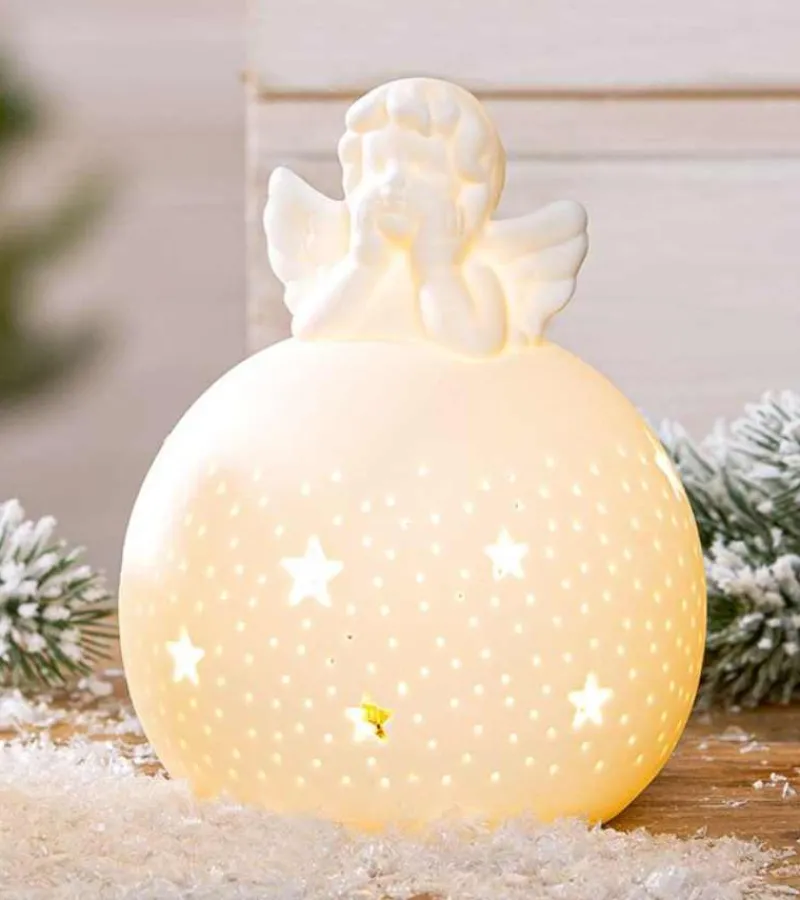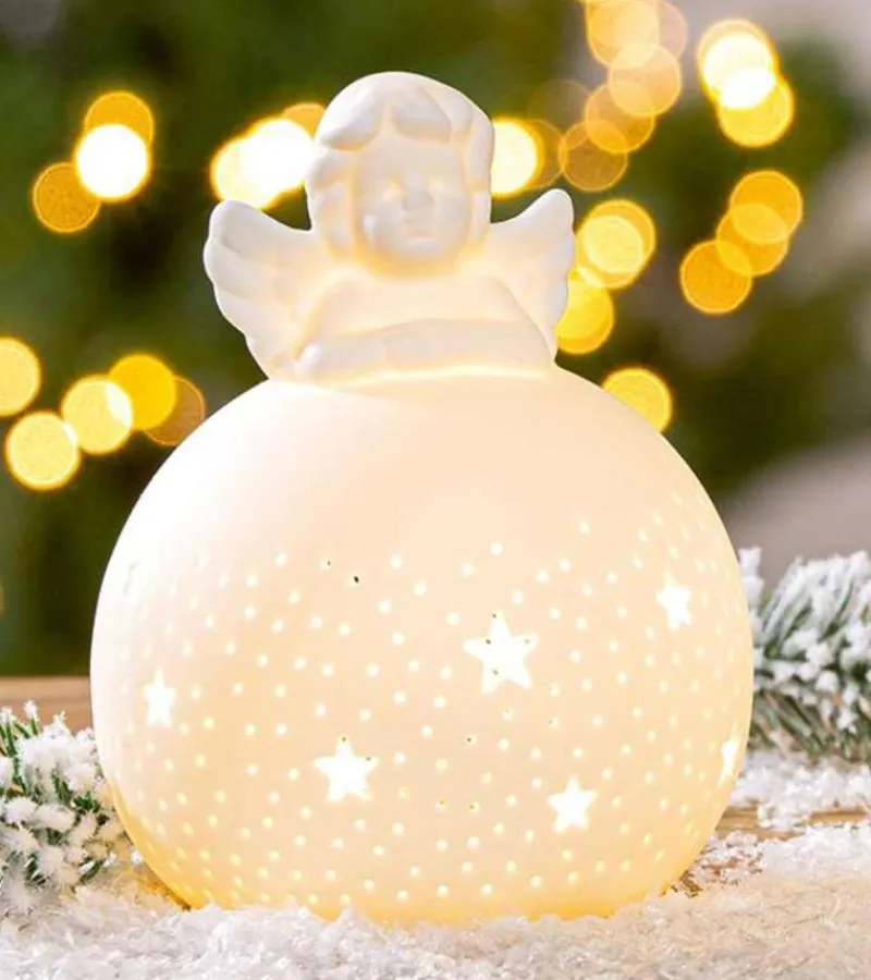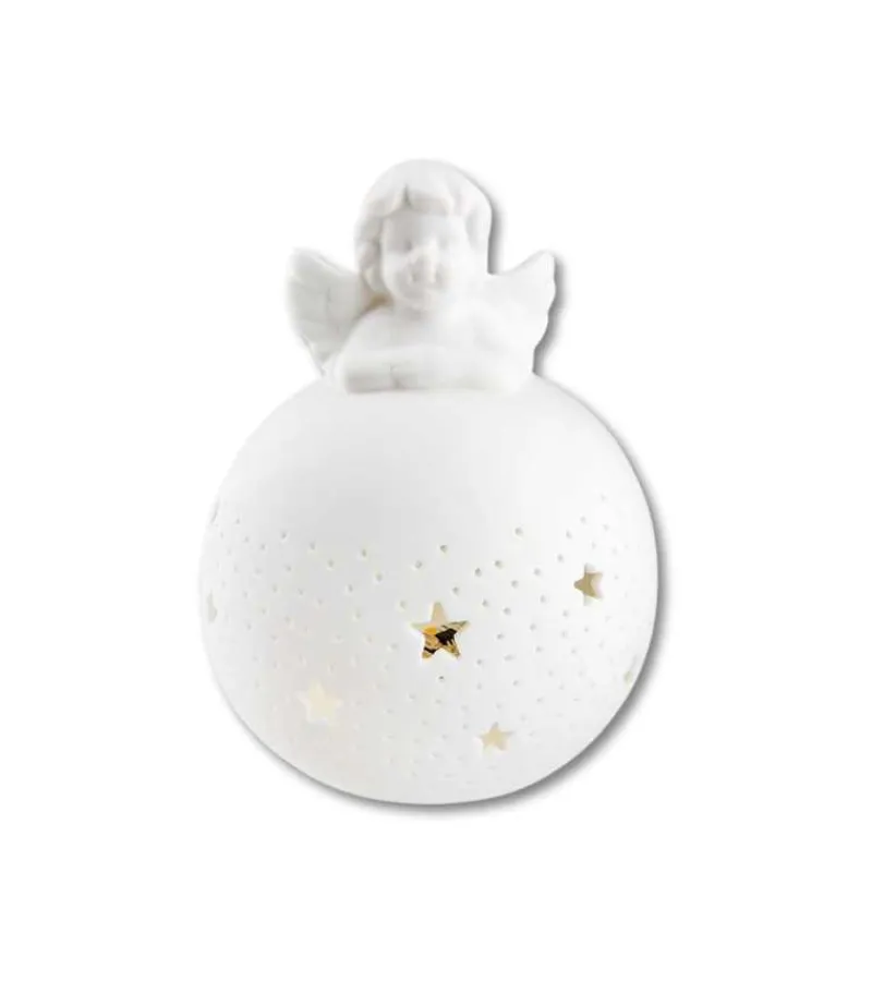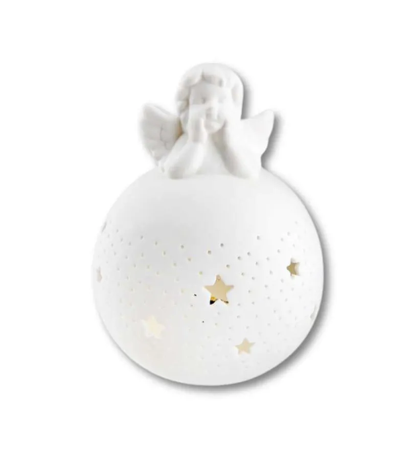 En sød engel sidder på toppen af en rund LED kugle. På kuglen er der fine stjerner.