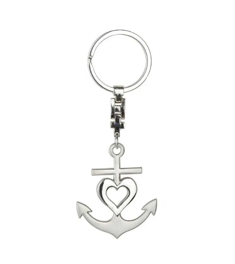 Solid Nøglering i metal med symbolet for TRO HÅB KÆRLIGHED i form af en anker for neden, korset øverst og et hjerte i midten.