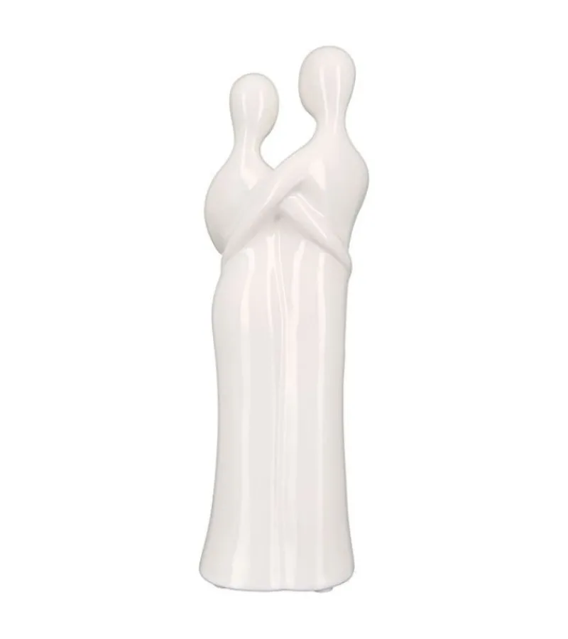 Skulptur af et par der holder om hinanden og i favnen har de et hjerte af sølv.