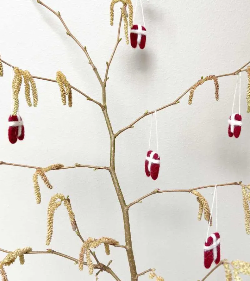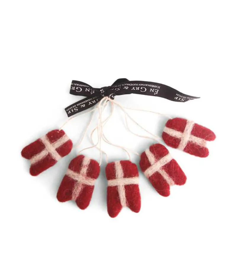 5 skønne små Dannebrosflag håndlavet i filtet uld. De er lige til at hænge på en gren eller ligge på bordet til en fødselsdag.