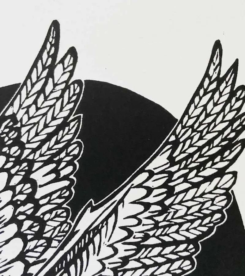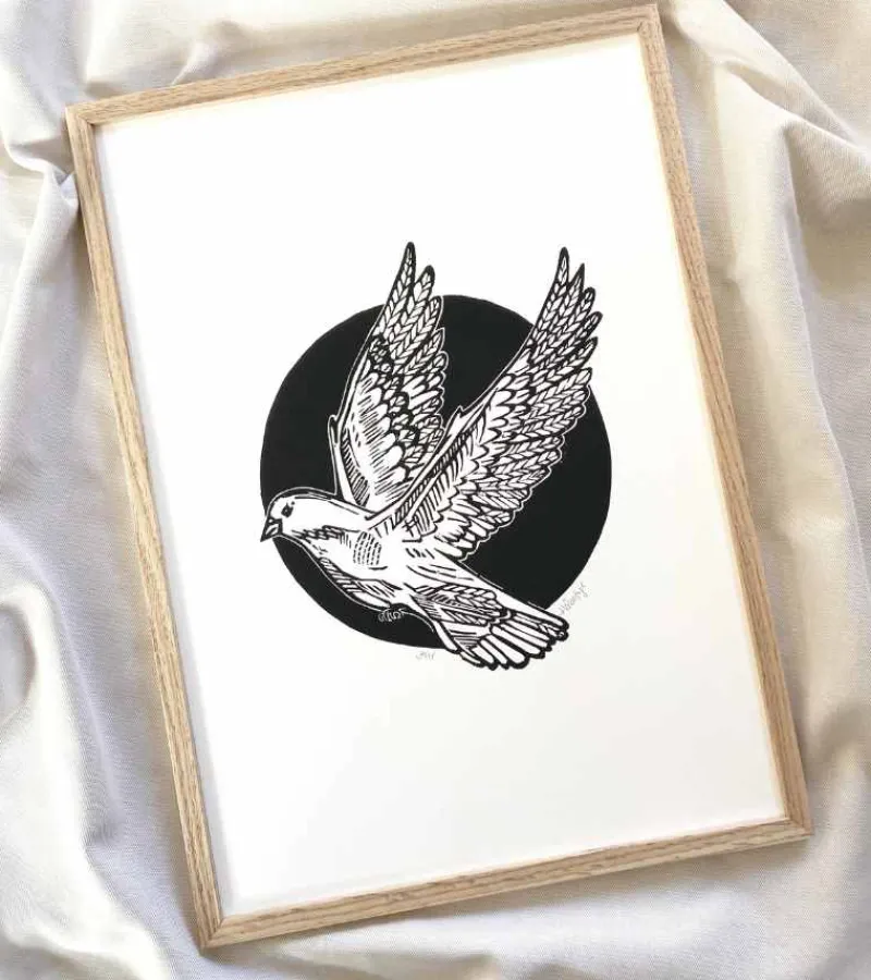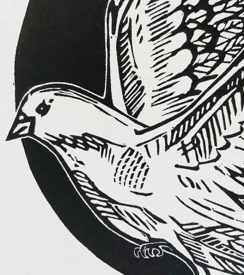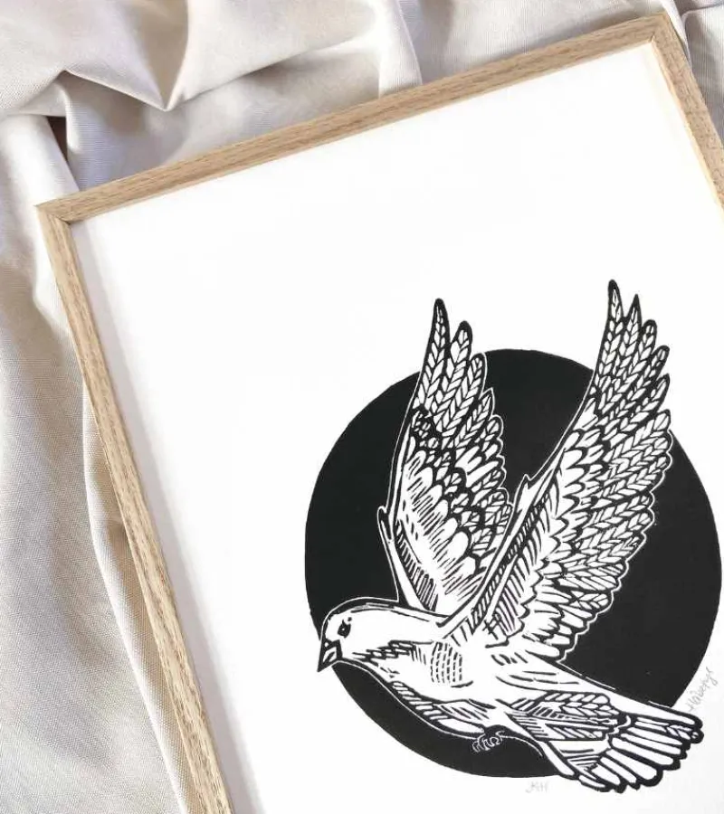 Et smukt linoleumstryk med titlen “Håbefugl”.