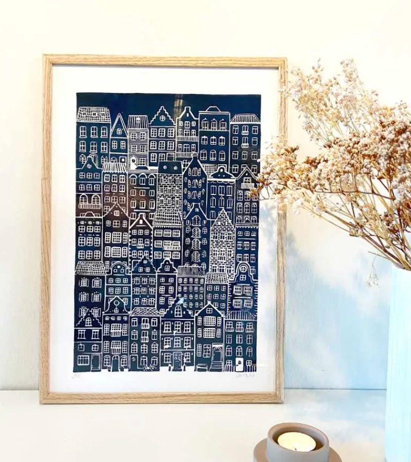 Linoleumstryk er en god kontrast til de meget grafiske plakater, man også kan finde herinde, og trykket arter sig særligt godt i en ramme med passepartout.