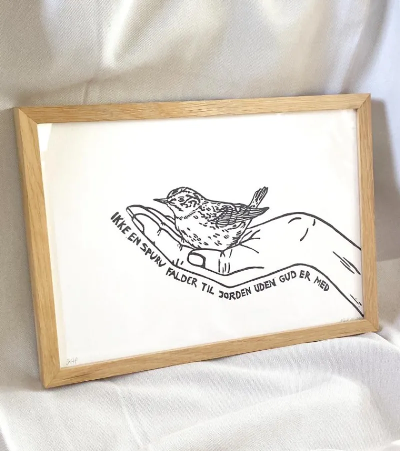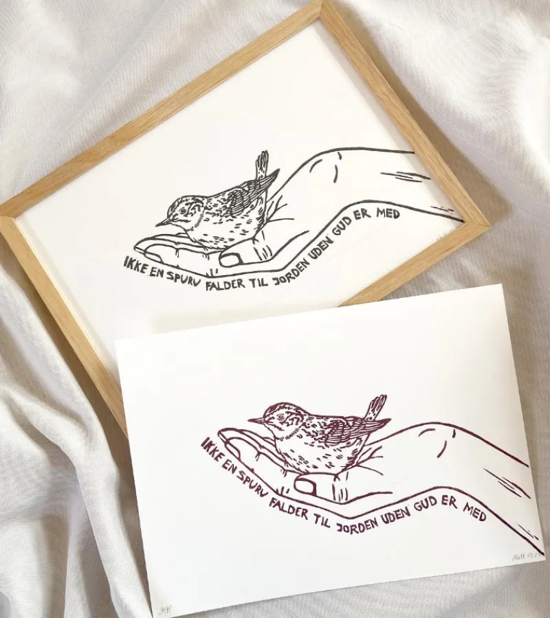 Dette smukke linoleumstryk er håndlavet af sognepræst Inge Marie Kirketerp Hansen på kraftigt papir. Derfor findes der små variationer som blot gør det enkelte tryk mere unikt.