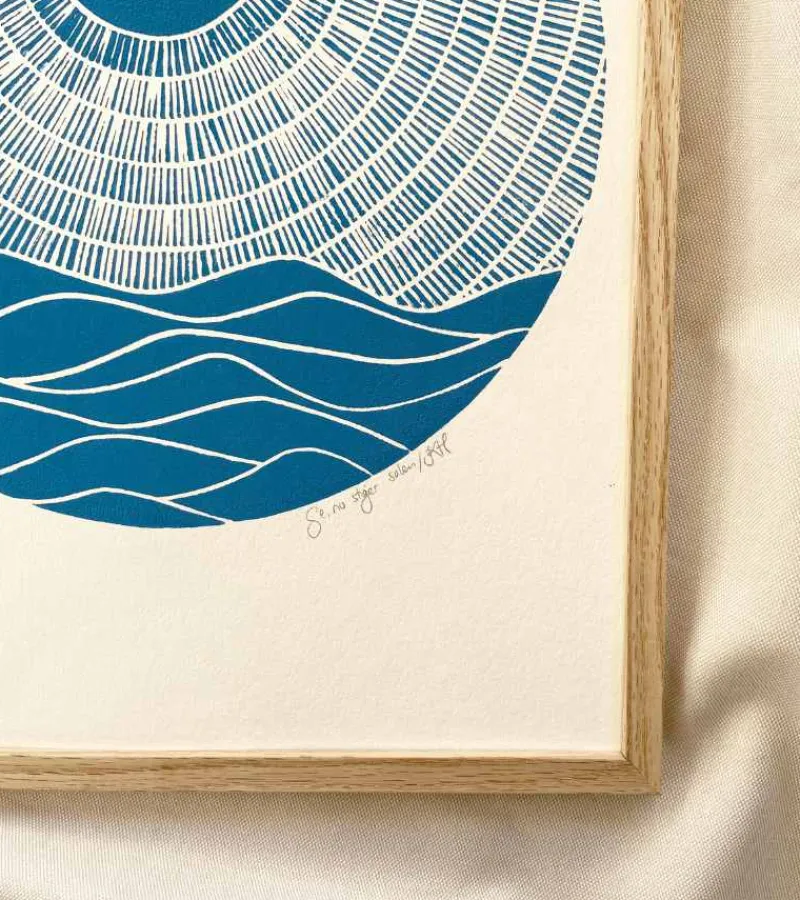 Et smukt linoleumstryk med titlen “Se nu stiger solen af havets skød”.
