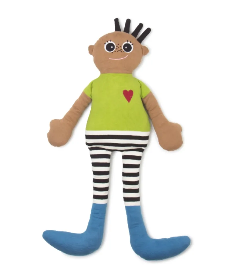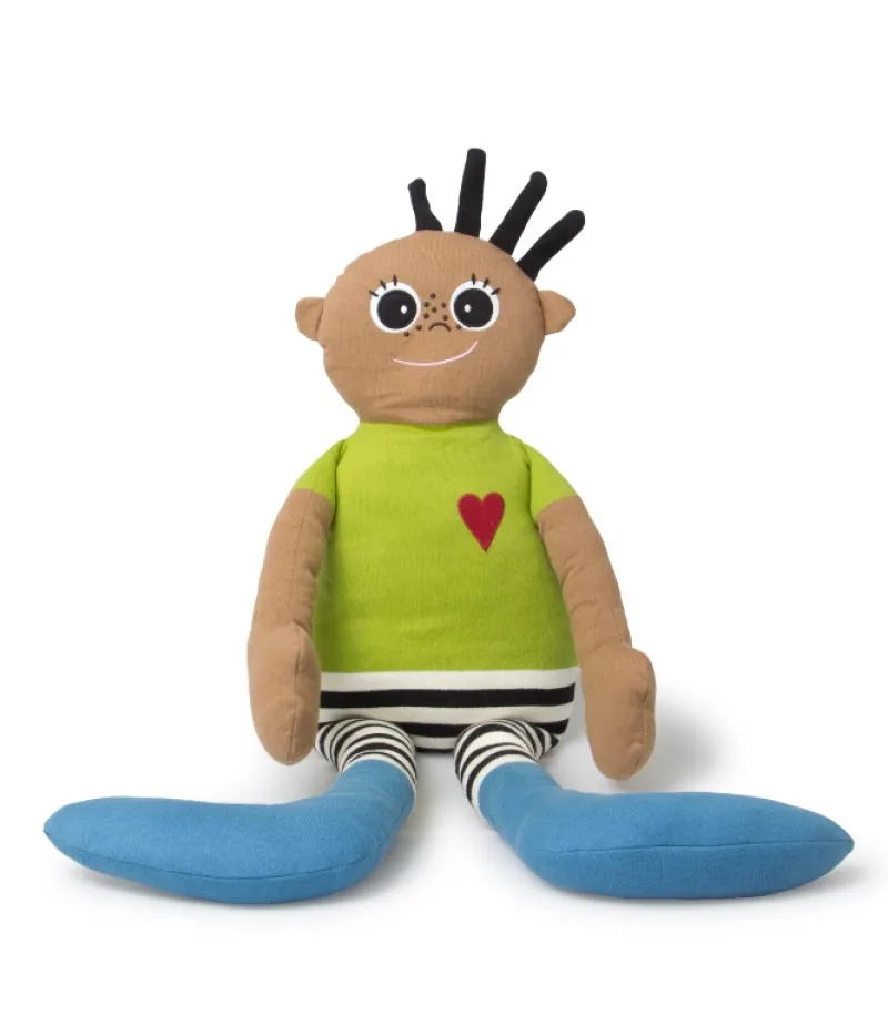 Skøn KAI dukke i strik. Fræk grøn T-shirt, blå sokker , stribede ben og et finr rødt hjerte.