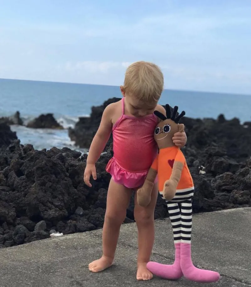 KAI dukken har Orange bluse, pink fødder, lange stribede ben og et fint rødt hjerte.