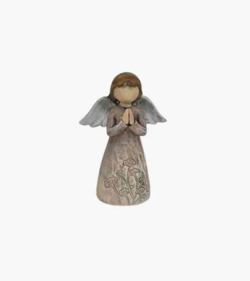 En fin lille englepige med blå-grå kjole. Hun har hænderne foldet.