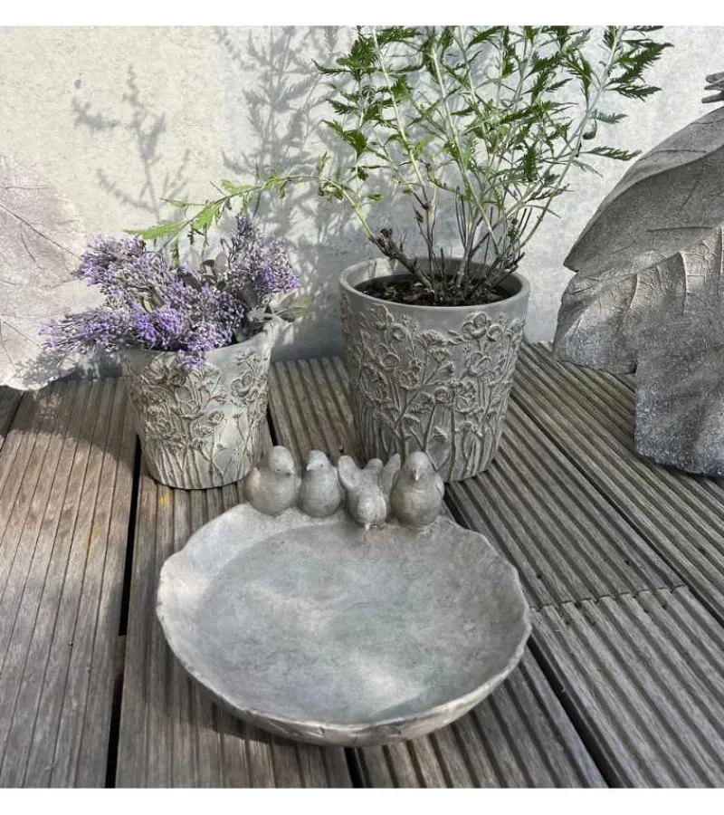 Flot og dekorativ fuglebad med 4 små fugle på kanten. Den kan stå på kirkegården eller i haven.