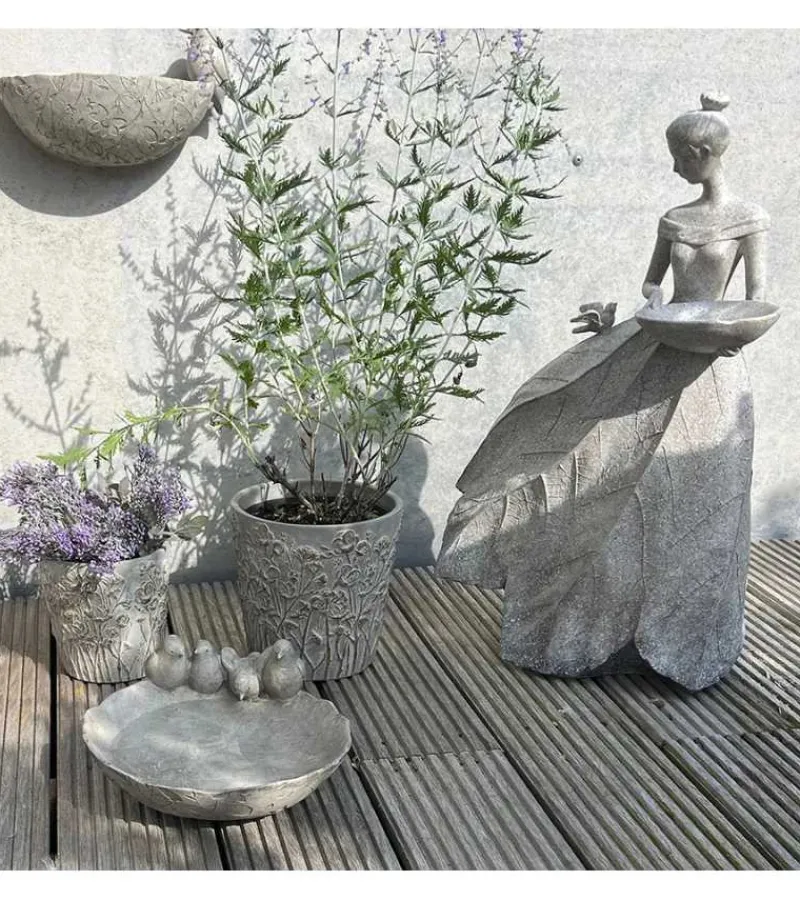 Den er lavet i polyresin og tåler derfor frost. Men vær opmærksom på at den kan sprænge i frost, hvis der er for meget vand i.