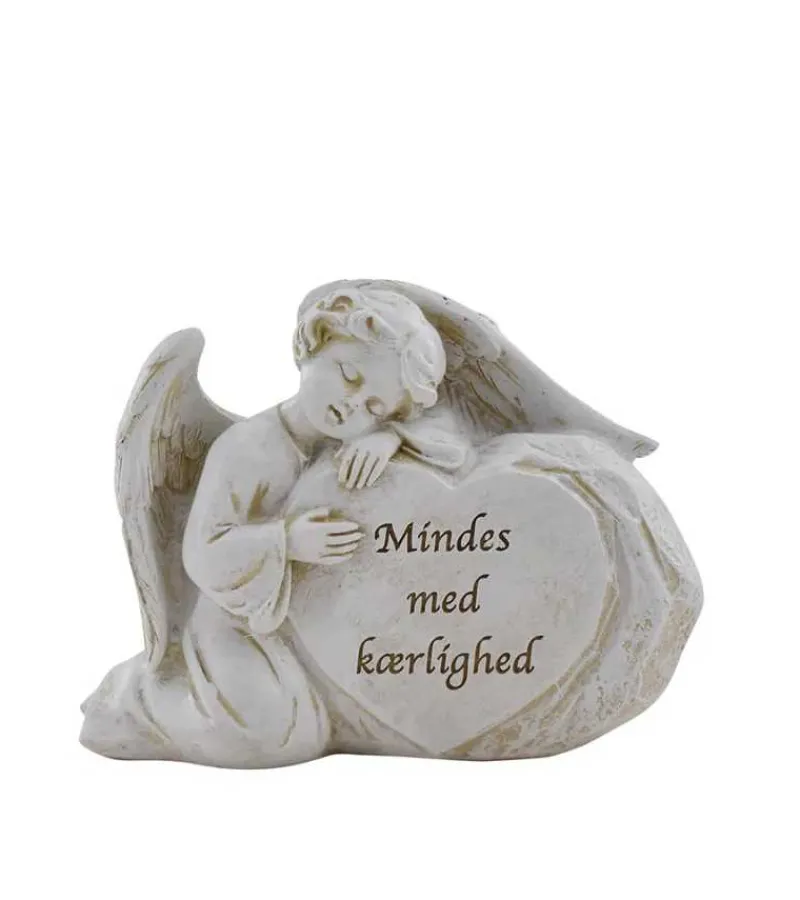 Fin og enkel Engel der sidder med et hjerte med teksten: Mindes med kærlighed.