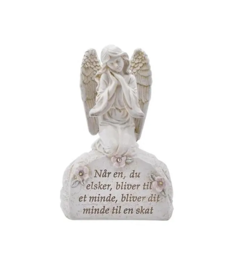 Denne figur forestiller en engel på en sten med indgraveret tekst: “Når en, du elsker, bliver til et minde, bliver dit minde til en skat”
