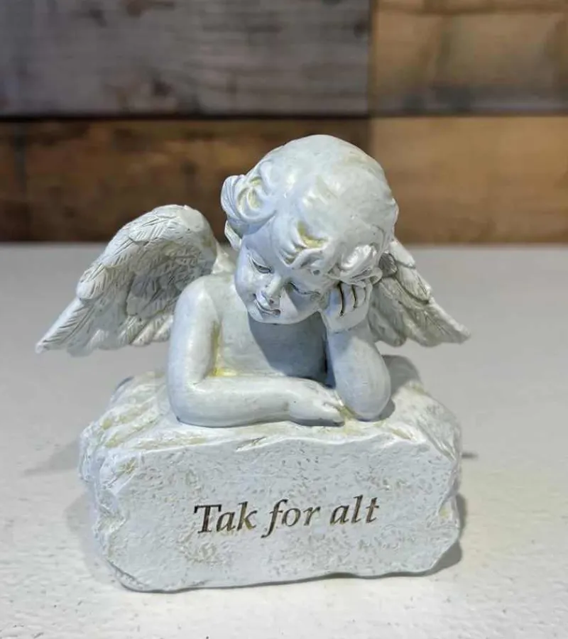 Engel på en sten hvorpå der står “Tak for alt”. Englen og stenen har en antik hvid farve.