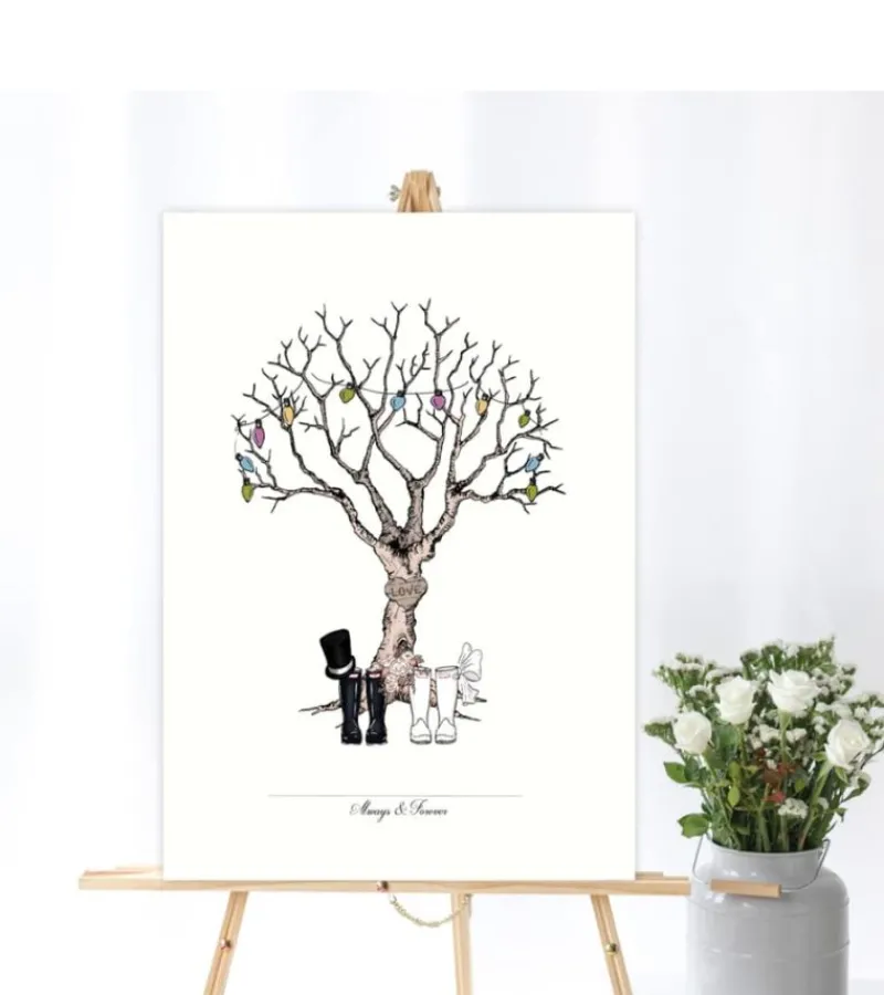Flot og unik fingerprint plakat med et familie- og vennetræ– med plads til alle gæsternes personlige fingeraftryk.