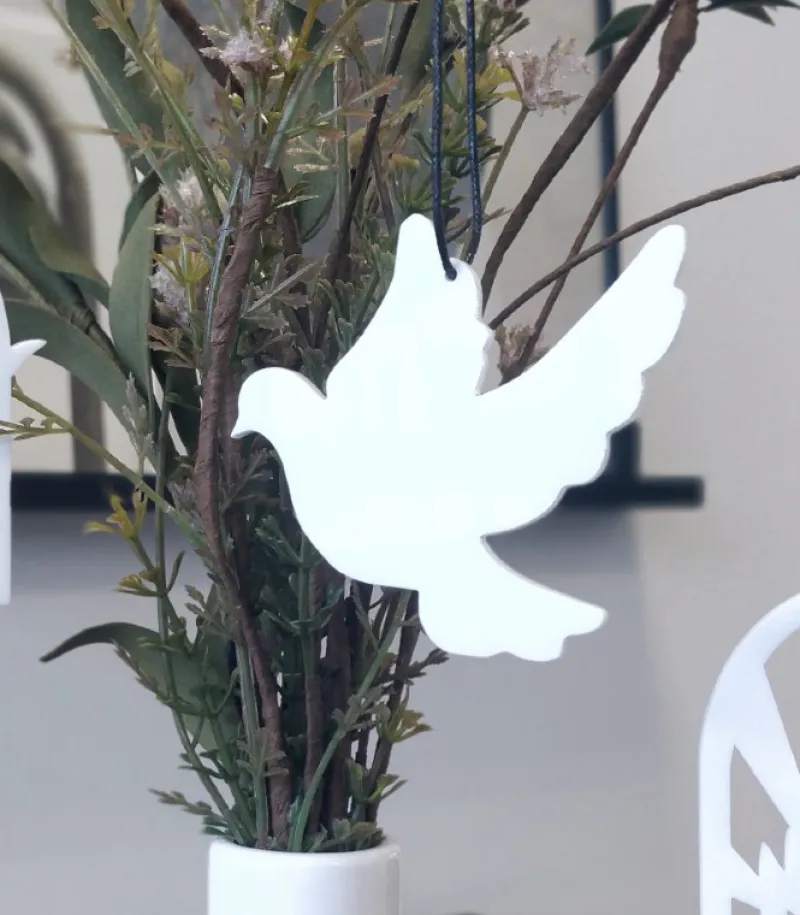 Ophænget er vores fortolkning af en fredsdue. Første gang man hører om duen i bibelen, er i beretningen om Noahs ark, hvor due flyver ud, og kommer tilbage med en lille kvist med blade.