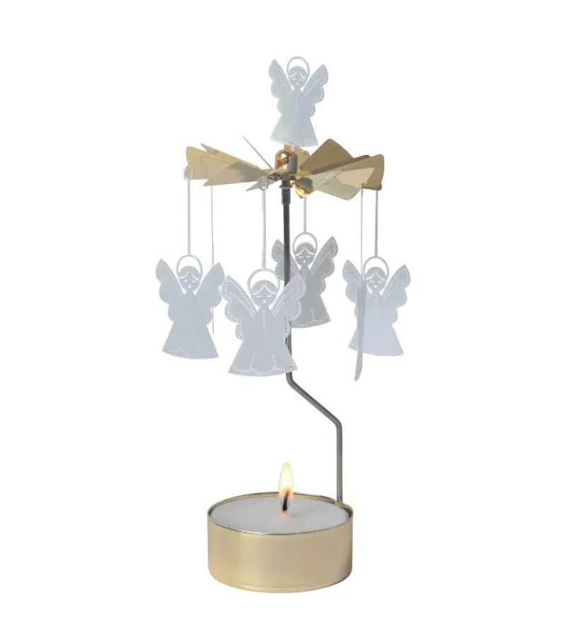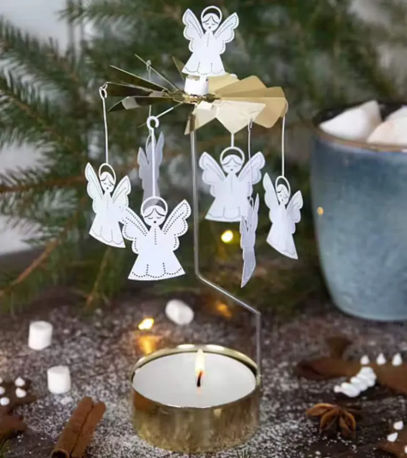 Den fineste englespil med 6 hvide engle, der snorrer rundt, når lyset brænder. Og englen på toppen snurrer med.