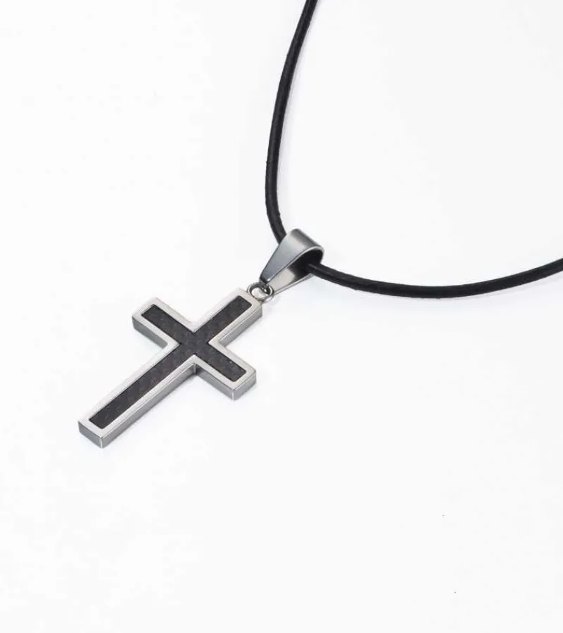 Maskulint kors i rustfri stål og med sort carbon fyld, der giver korset en ekstra dimension.