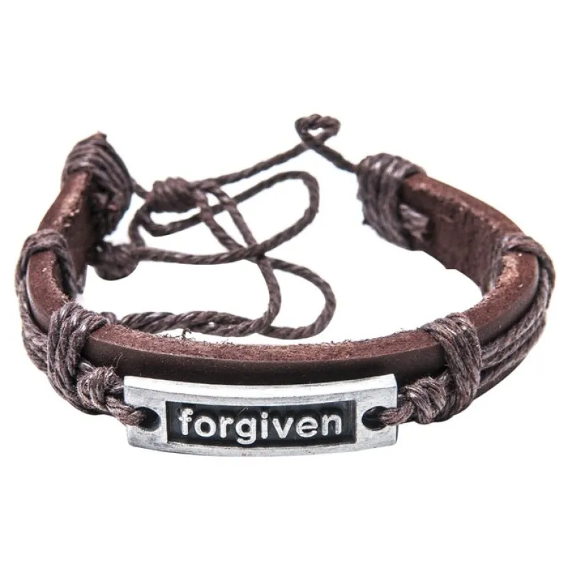 Fint brunt læderarmbånd, med charm hvor skriften “Forgiven” står.