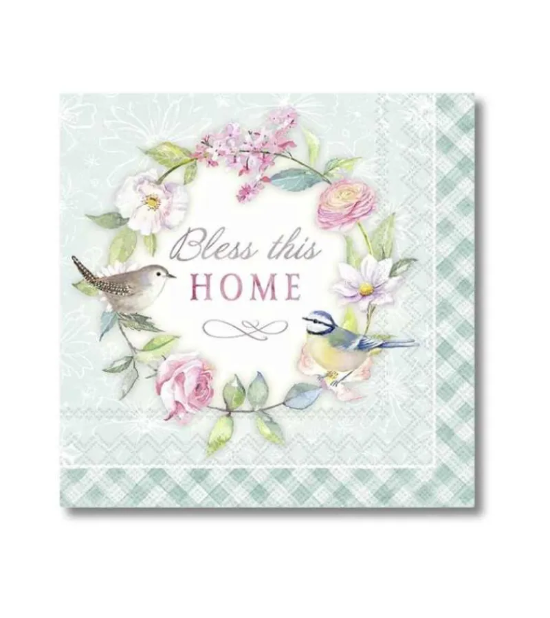 Fine servietter med print af fugle og teksten “Bless this home”.