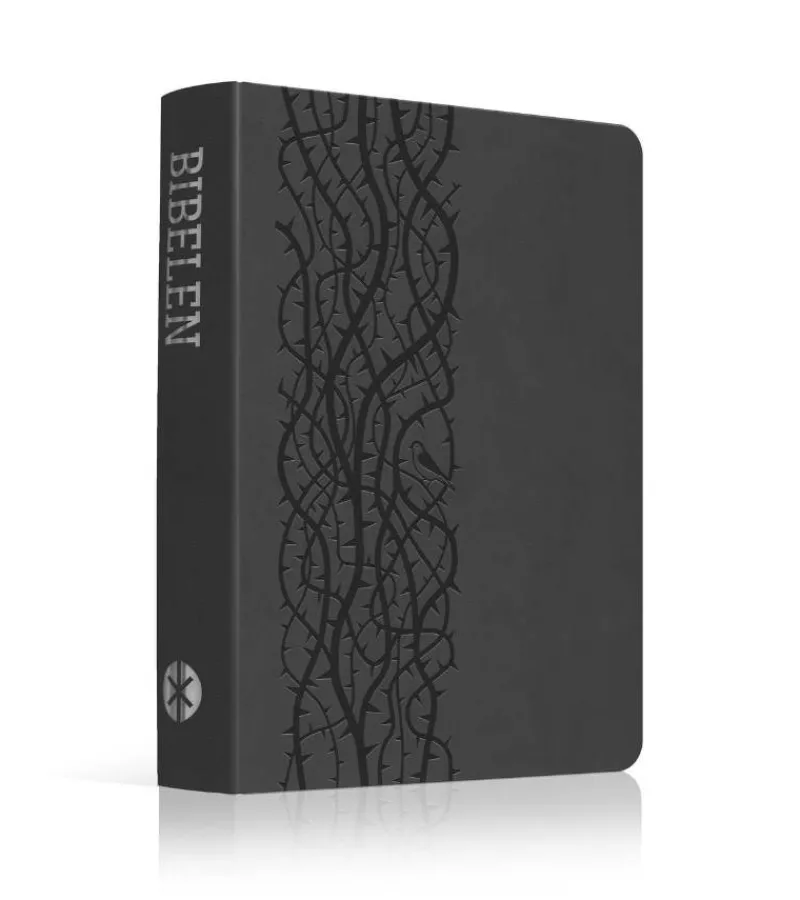 Bibelen på Hverdagsdansk med en grå indbinding der har påtrykt en tornebusk med en lille fugl.