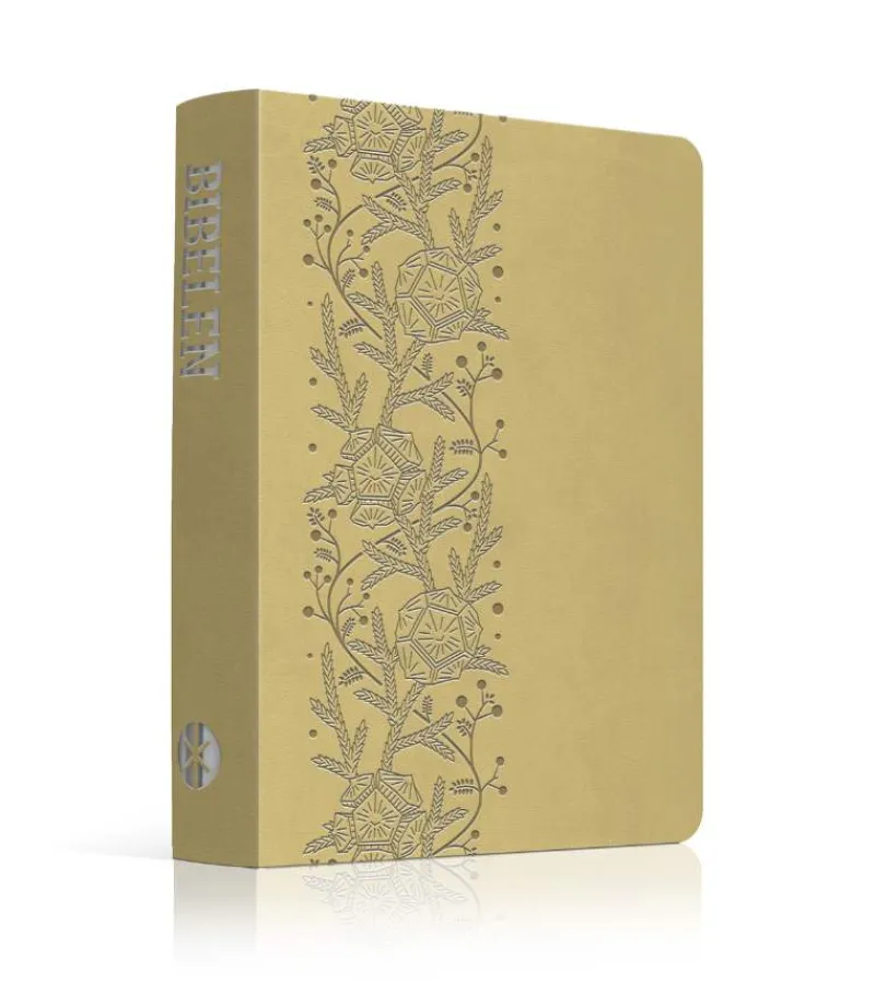 Bibelen på Hverdagsdansk med beige indbinding der har påtrykt et bånd med gren ranker.