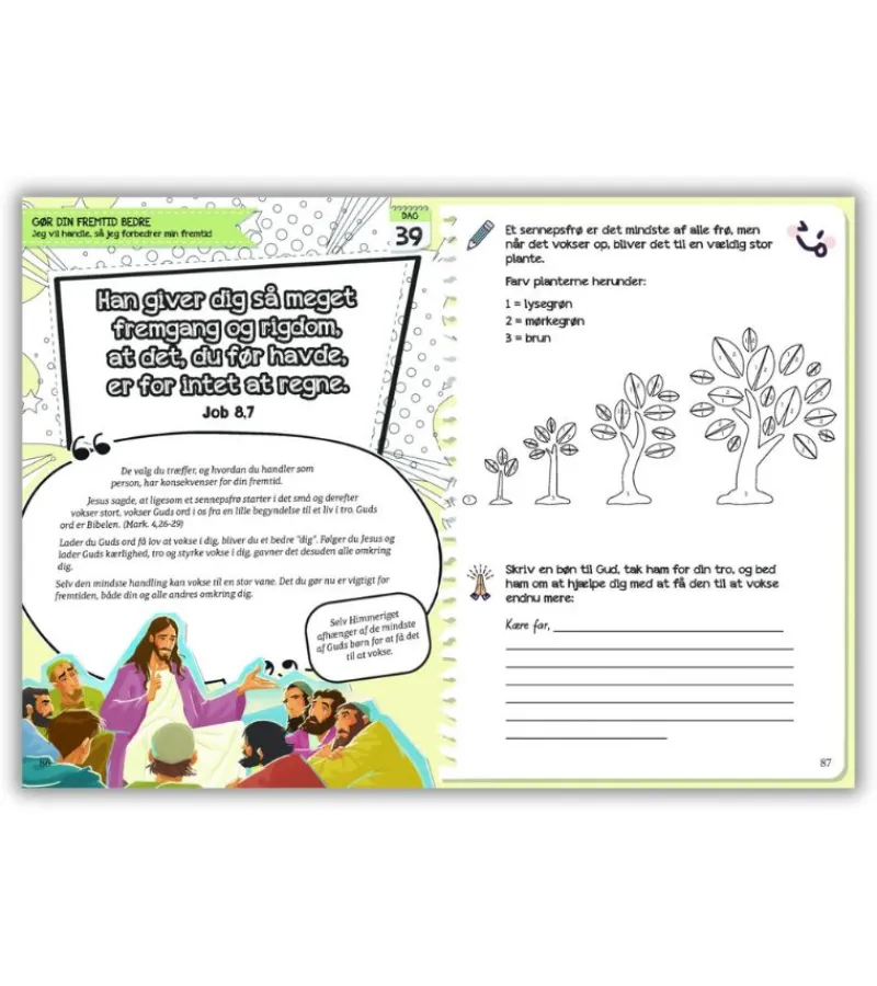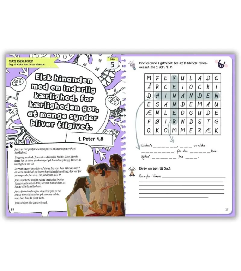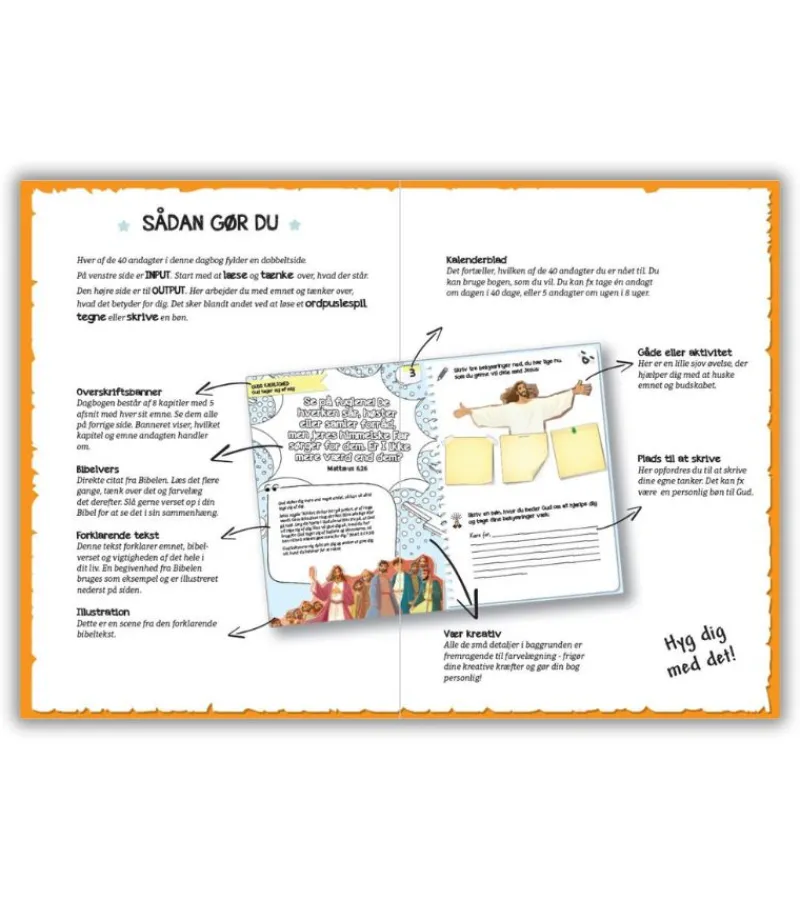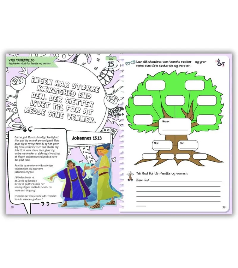 Kreativ Bibeldagbog indeholder 40 forskellige andagter til at vokse i troen. Læs, tegn og løs gåder og få en bedre forståelse af Bibelen.