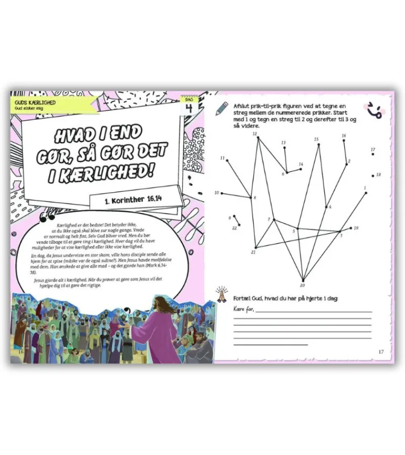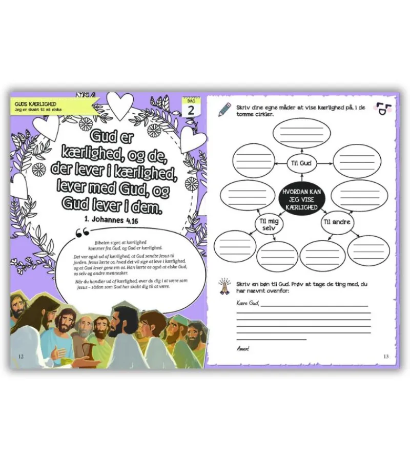 Udforsk Bibelen på en kreativ måde med Kreativ Bibeldagbog. Denne unikke og inspirerende dagbog indeholder bibelske tekster og opfordrer dig til at udforske dem gennem tegning, farvelægning og skrivning. Velegnet til de 8 til 12 årige.