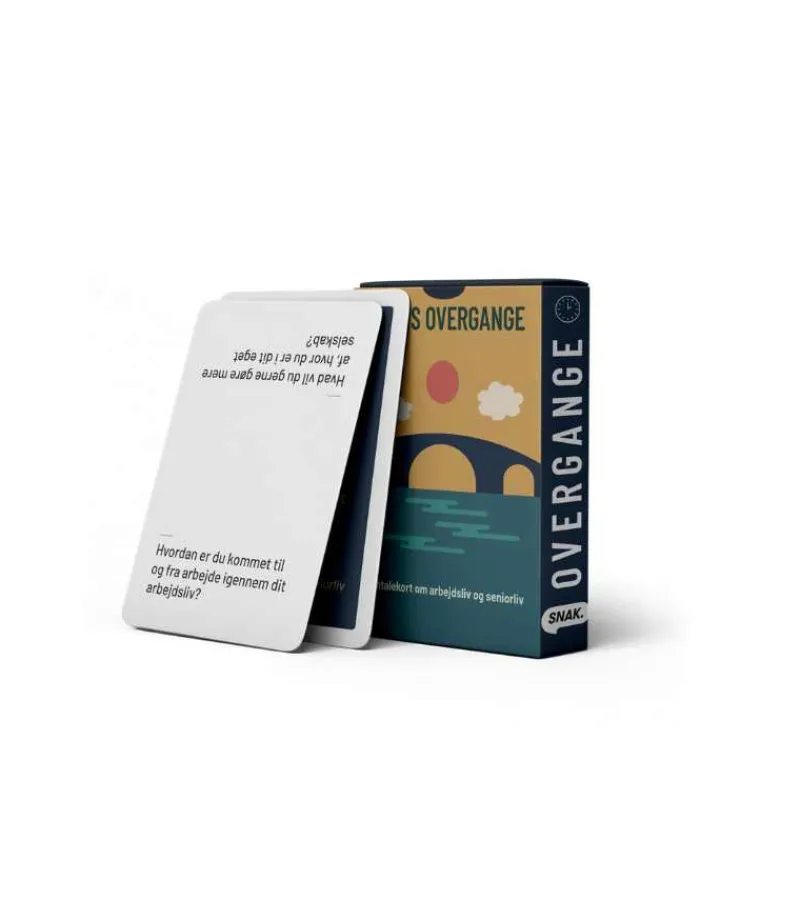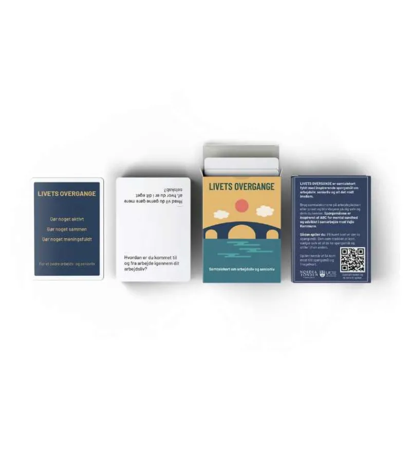 LIVETS OVERGANGE er samtalekort fyldt med inspirerende spørgsmål om arbejdsliv og seniorliv – og det midt imellem – der giver mening og værdi for kommende og nye seniorer.
