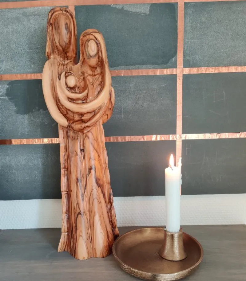 Dekorativ krybbespil der er håndskåret i oliventræ.