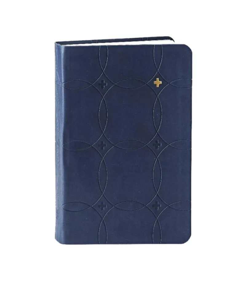 Lille bibel indbundet i blød kunstlæder i en smuk mørkeblå farve. Bogen har et enkelt mønster, som er præget i skindet og et lille guldkors på forsiden.