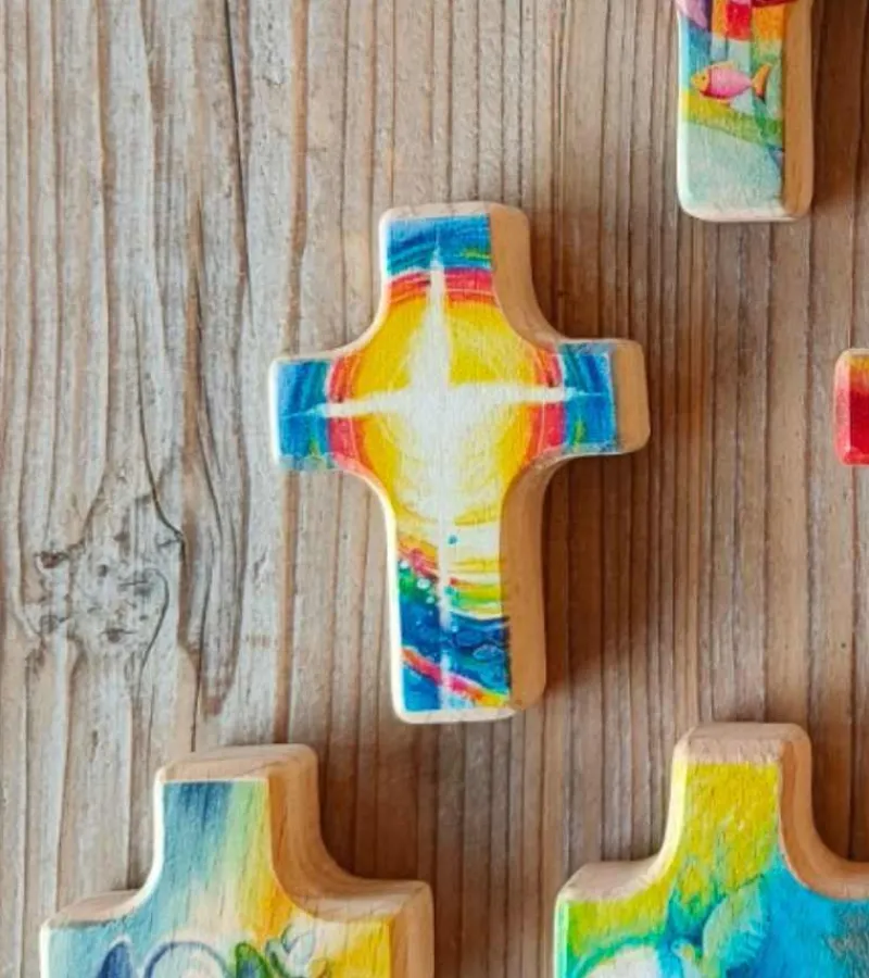 På korset er der malet et kors som lyser over noget vand med fisk. Både fisk og kors er kendte symboler på kristendommen. Trykket på korset kan forstås på forskellige måder og have en særlig betydning for hver enkel.