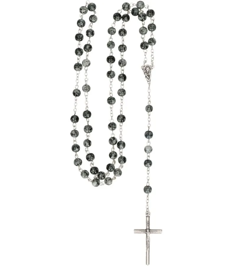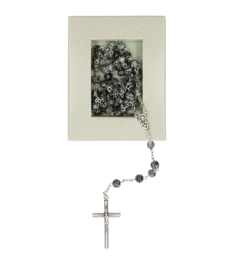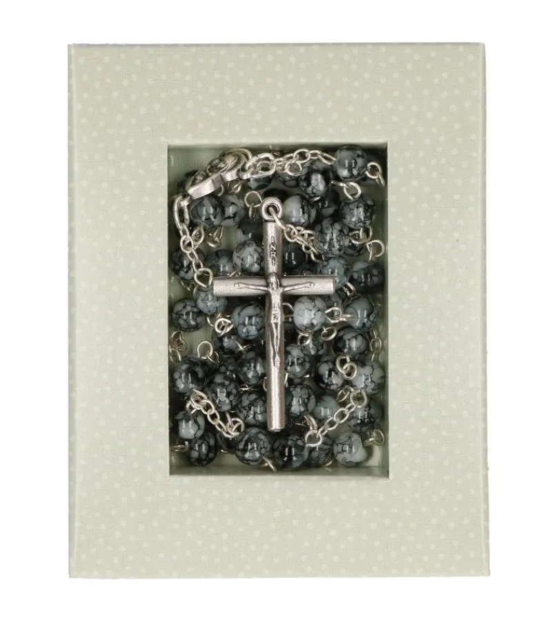 Fin rosenkrans med grå, marmorerede glasperler og et smukt metalkors.