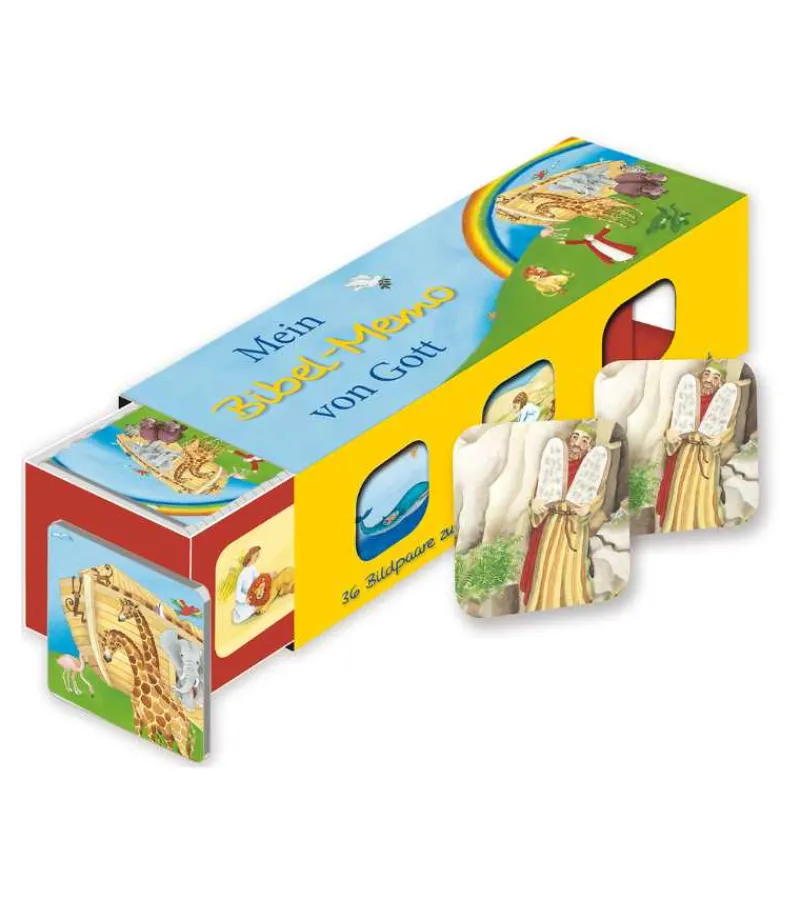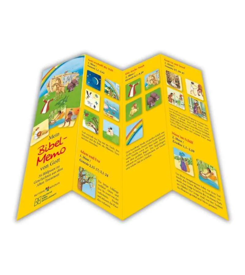 Vendespil med fine illustrationer af fortællinger fra Det Gamle Testamente. Der er fortællinger som Noas ark, Daniel i løvekulen og Jonas og hvalen. Det er i alt 36 billedpar, med forskellige fortællinger. Til hvert billedepar, hører en billedtekst og en reference til en bibeltekst, som findes i det medfølgende hæfte. Dog er teksten på tysk, men bibelhenvisningen er til at forstå.