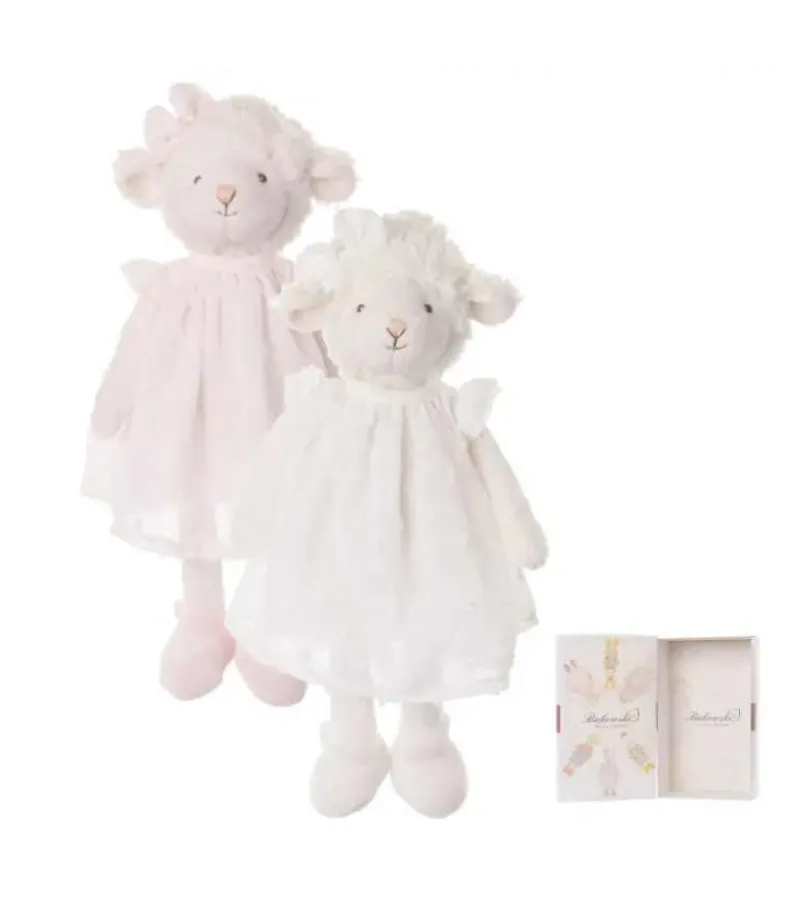 Den skønneste bamse-lam med en fin hvid kjole på og en hvid sløjfe på hovedet.