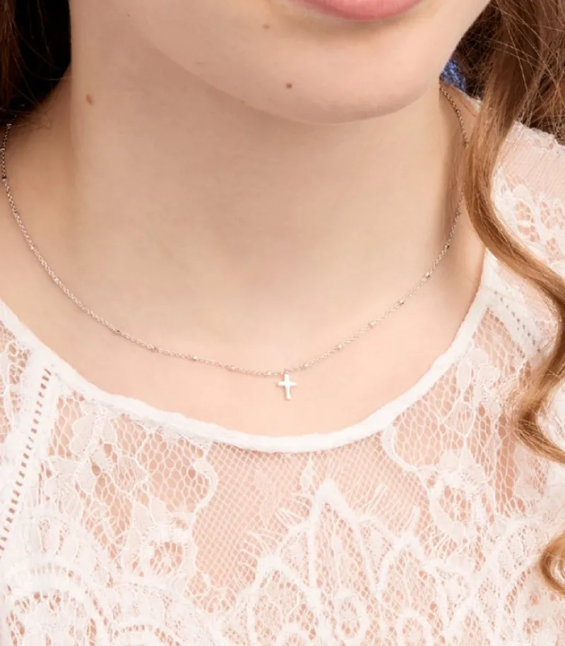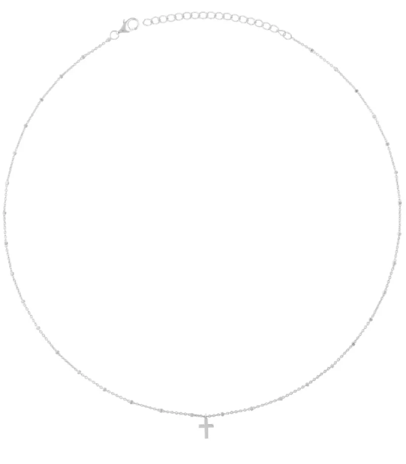 Fin kort kuglekæde med et enkelt lille kors placeret midt på kæden. Til halskæden findes også et armbånd. Kæden har en 5 cm lang extension kæde, så du kan justere længden, som du ønsker den.