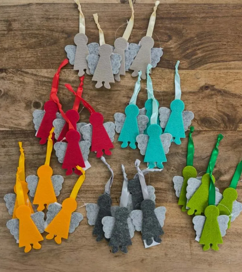 Hver engel er i to farver og med et fint satin bånd. Englen kan hænges på skoletasken. Eller på juletræet. I nøglebundten. Ja, alle mulige steder.