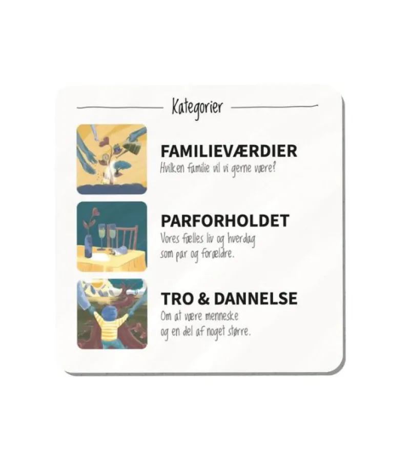 Æskens 30 samtalekort er inddelt i tre kategorier: Familieværdier, Parforholdet samt Tro & dannelse.