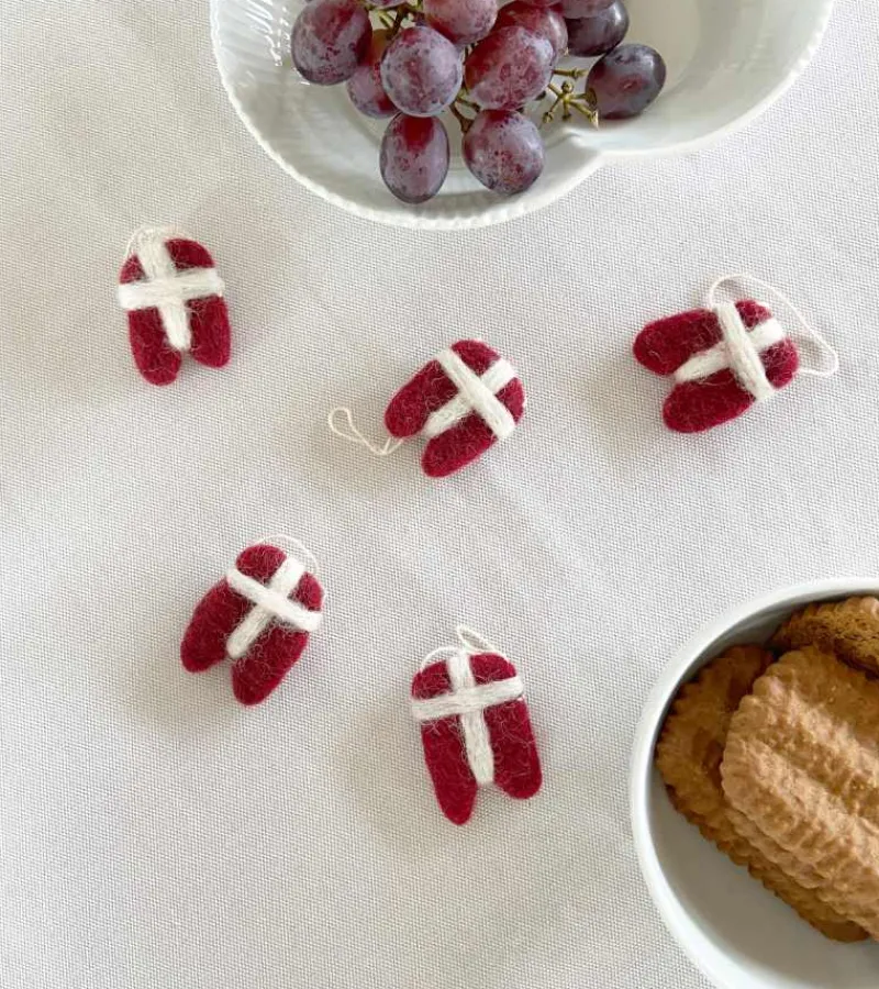 5 skønne små Dannebrosflag håndlavet i filtet uld. De er lige til at hænge på en gren eller ligge på bordet til en fødselsdag.
