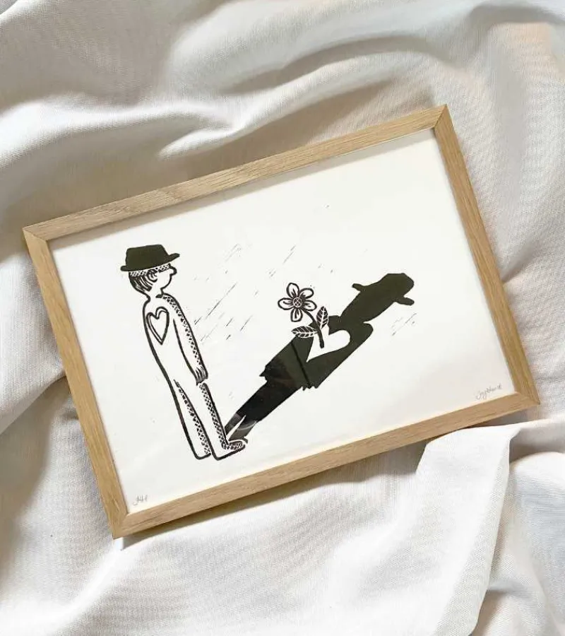 På et utal af måder har mennesker beskrevet sorgen, for hvordan skal man med ord kunne opsummere noget så altomsluttende, så komplekst som sorg? Nogle gange er billeder måske bedre…Jeg husker en lille illustration, jeg så for mange år siden. Den forestillede en mand med et hjerteformet hul i brystet, hvilket kunne ses på hans skygge, der lagde sig hen ad jorden. Der, hvor der var et hjerteformet hul i skyggen, bryder en lille blomst frem. Den illustration har jeg altid været glad for, og nu har jeg lavet den som linoleumstryk.
