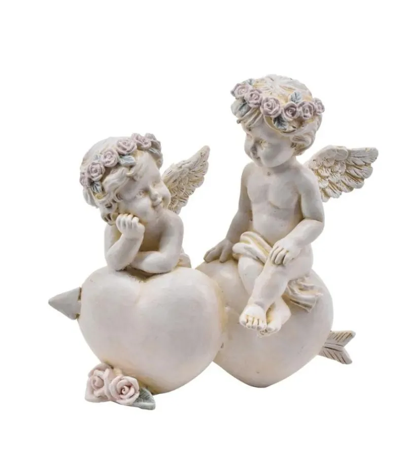 To små engle, der sidder på et par hjerter. Der er små lyserøde blomster.