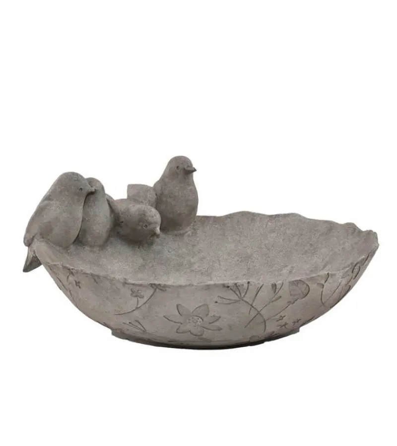 Flot og dekorativ fuglebad med 4 små fugle på kanten. Den kan stå på kirkegården eller i haven.