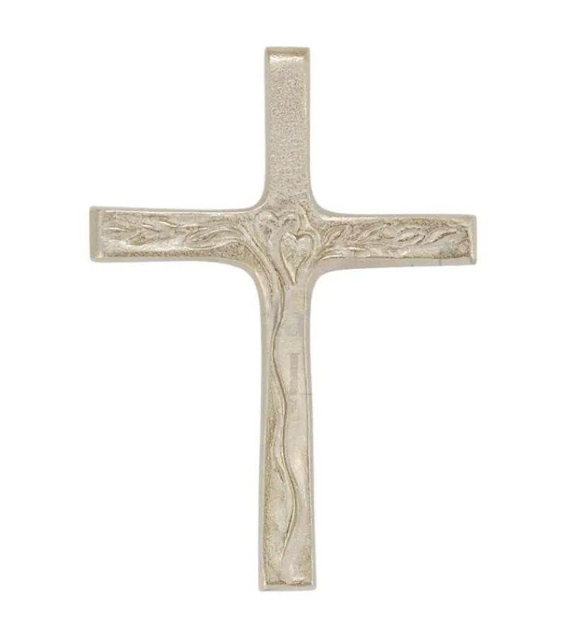 Den har to hjerter præget i midten med grene, der snor sig op ad korset.