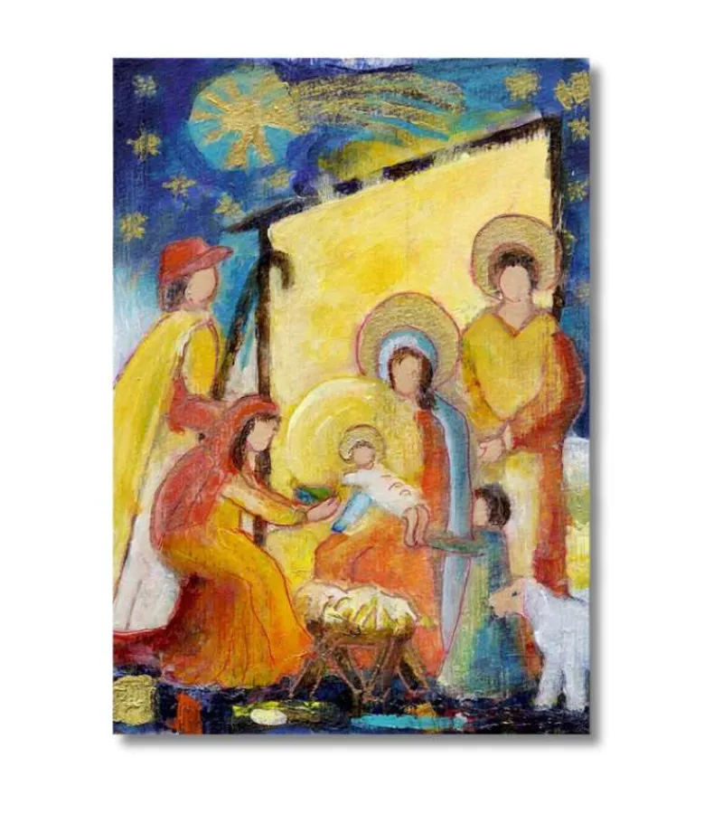 Smukt julekort med Jesus julenat, der har besøg af hyrderne.